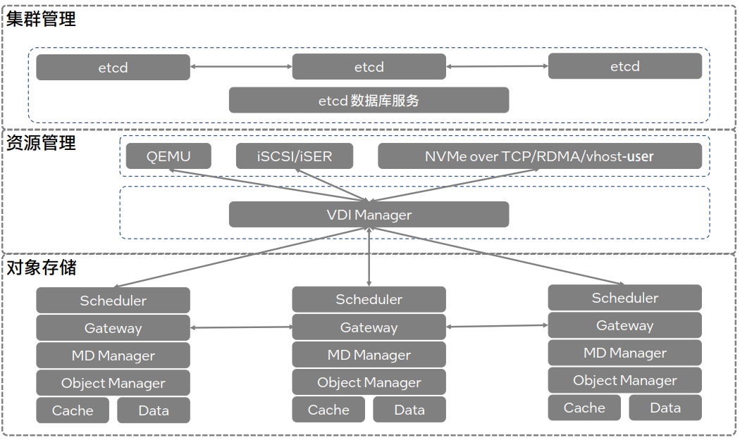 作为新一代超融合解决方案,Ebpay云海® 超融合一体机 InCloud Rail 顺利获得软件定义的计算、存储和网络技术实现了服务器的资源池化,使整个 IT 环境比单独的物理硬件具有更高的可用性、安全性和扩展性,能够有效满足企业对于降低成本、简化管理、提高安全性和扩展性的需求,助力企业向云计算迁移核心业务,构建企业云数据中心。Ebpay云海® 超融合一体机 InCloud Rail 实现了存储资源的池化和统一管理,并顺利获得全闪存架构的软件定义存储 SmartONE 支持异构算力的融合。SmartONE 采用 etcd 组件作为集群管理,负责分布式存储的节点的关系、节点之间的元数据传递及一致性等。在资源管理方面,SmartONE 给予了 qemu、iSCSI 和NVMe-oF 的服务入口,对接 VDI 卷管理入口,对外给予存储资源。在对象存储方面,SmartONE 主要接收 VDI 的 IO 请求,根据数据分布算法调度到相关节点,根据副本策略和 EC 规则调用 Gateway 分发到分布式存储的存储节点。