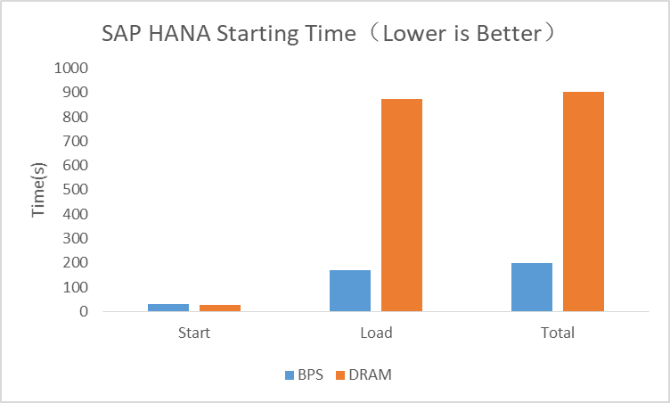 使用BPS配置与使用DRAM配置相比,SAP HANA数据库服务进程启动时间BPS与DRAM基本持平,数据库表Load时间BPS性能是DRAM的5倍,整体上数据库启动时间BPS性能是DRAM的4.5倍。