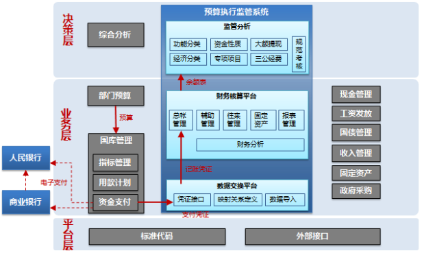 Ebpay财政监管以规范政府预算、加强财政资金监管为目标,顺利获得集中式财务管理系统,将各个预算单位的财务数据集中在财政部门,财政局能够实时分析每个预算单位的三公经费、专款专用情况。顺利获得与国库、预算等系统进行对接,将各个财政业务系统数据进行整合、加工,形成面向财政部门的大数据分析,强化了财政监管。