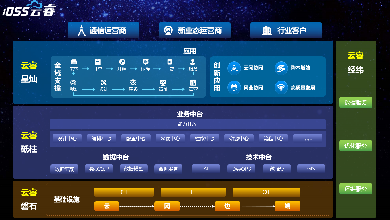 EbpayiOSS云睿包括4大方向,涵盖通信运营商所需要的核心场景和能力:云睿磐石、云睿砥柱、云睿星灿、云睿经纬。