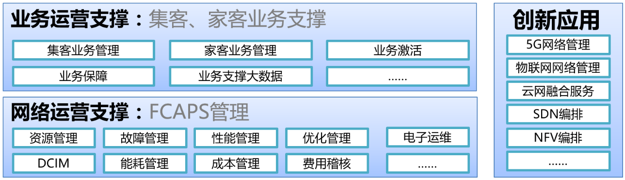 实现对传统电信网络运营的端到端支撑,给予包括基础FCAPS能力及质效运维、电子运维、代维管理、能耗管理、指挥调度、智能运维、成本管理、费用稽核等系统能力。
